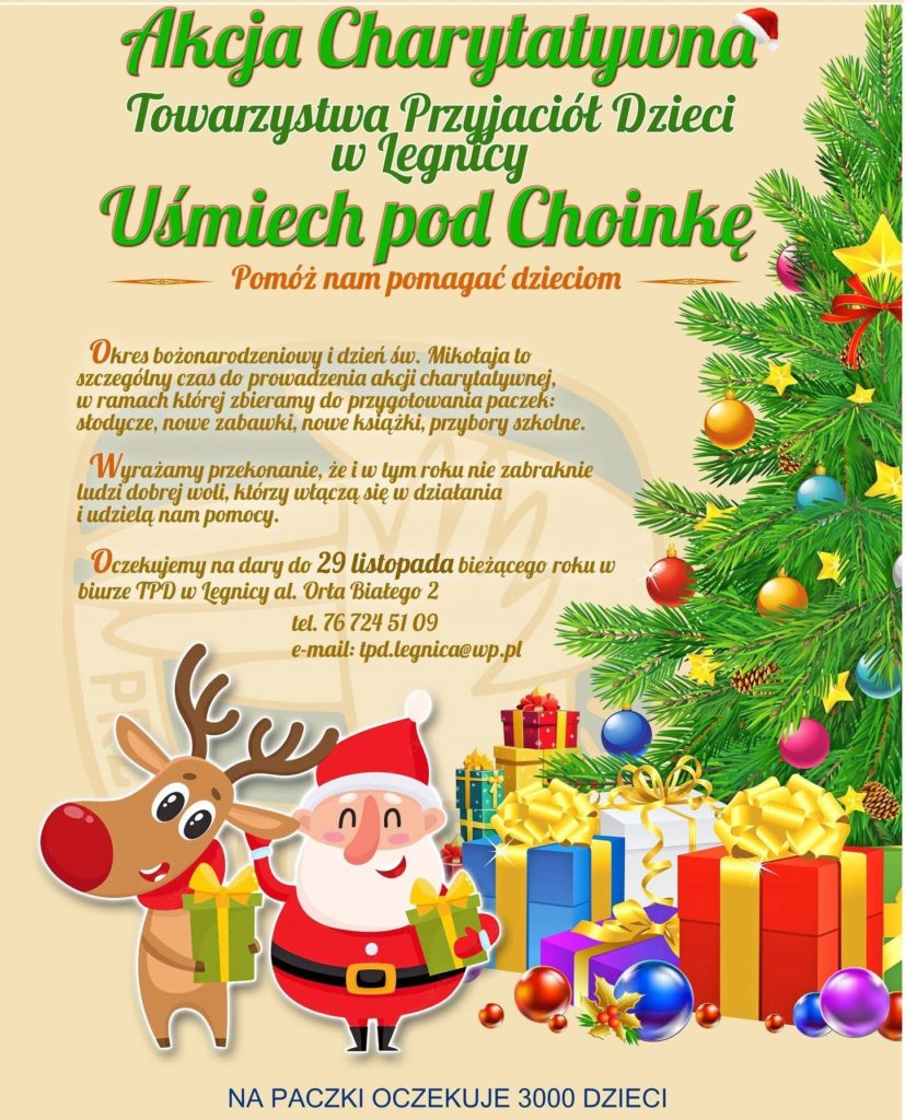 Wierzymy, że w tym roku również nie zabraknie ludzi o wielkich sercach, którzy wesprą naszą akcję. Zbieramy dary do 29 listopada w biurze TPD w Legnicy, al. Orła Białego 2.